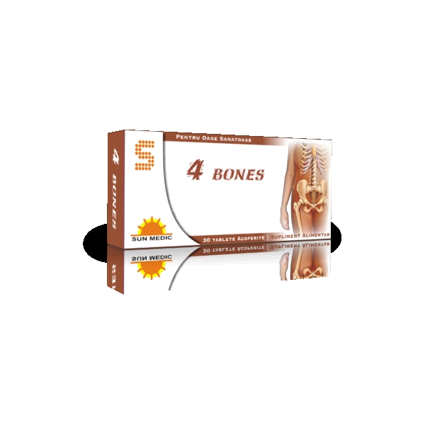 4 bones este un produs pentru mentinerea densitatii osoase, ajuta la buna functionare a sistemului nervos si muscular.Produsul este indicat in :carenţă de calciu, ca supliment alimentar pentru creşterea aportului de calciu pentru menţinerea stării de sănătate a oaselor, oboseală excesivă, pentru femei însărcinate sau care alăptează, femei la menopauză.