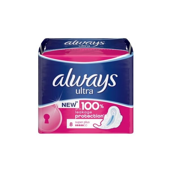 NOTA: Fotografia produsului Always Ultra Super Plus 8buc produs de Procter & Gamble are caracter informativ si poate contine accesorii ce nu sunt incluse in pachetul standard al produsului sau pot exista diferente intre aceasta si produsului Always Ultra Super Plus 8buc.