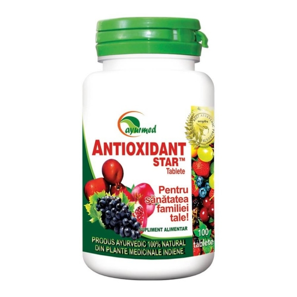 Suplimentul alimentar ANTIOXIDANT STAR™ contine extract din samburi de struguri (Vitis vinifera), pulbere din fructe de jujuba (Ziziphus jujuba) si de rodie (Punica granatum), plante ayurvedice folosite ca suport pentru sanatatea si vitalitatea organismului. Complexul de ingrediente neutralizeaza radicalii liberi si mentine nivelul normal al antioxidantilor, protejand astfel organismul de procesele oxidative, degenerative si de imbatranirea prematura. Produsul are un rol important in mentinerea sanatatii sistemului nervos, imunitar, urinar, cardiovascular si, in special, al celui venos. De asemenea sustine digestia si procesul de detoxifiere.