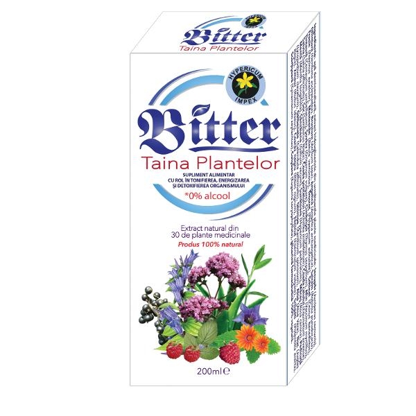 Bitter: tonic, stimulent general al organismului, imbunatatirea circulatiei periferice, antihemoroidal, usor laxativ, imunostimulent, depurativ, digestiv, coleretic-colagog, analgezic, geriatric, antioxidant. Bitterul Taina Plantelor fara alcool contribuie la tonifierea organismului si intarirea imunitatii naturale. Proprietatea depurativa a acestui produs il face sa fie foarte eficient in curatirea organismului de toxine.