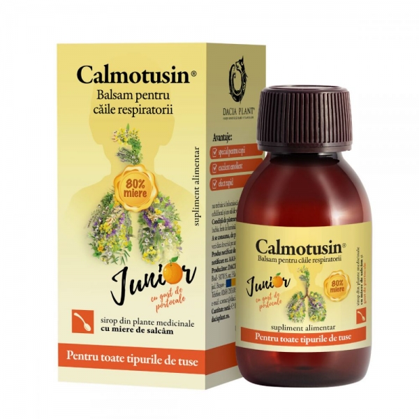 Siropul Calmotusin junior cu gust de portocale este un produs conceput pentru SUSTINEREA RESPIRATIEI LA COPII, realizat pe baza de miere de salcam (80%), extracte de plante, uleiuri esentiale si aroma naturala de portocale. PRODUSUL ARE EFECT EMOLIENT, FLUIDIFIANT A SECRETIILOR BRONSICE, EXPECTORANT, ANTIINFLAMATOR, CALMANT.