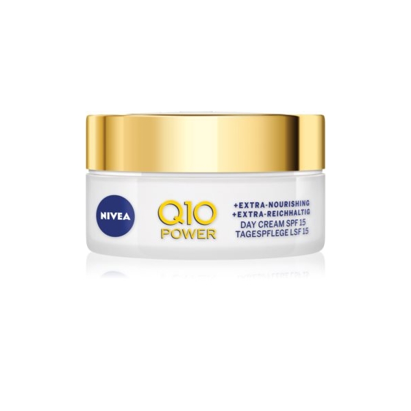 Oferiți tenului matur protecție cu ingrediente active deosebite. Îmbogățită cu coenzima Q10 și creatină, crema de zi Nivea Q10 Power conferă pielii beneficii anti-îmbătrânire, prevenind apariția ridurilor și a liniilor fine. Îmbogățită cu SPF 15, crema hidratează pielea și o protejează împotriva razelor UVA și UVB.