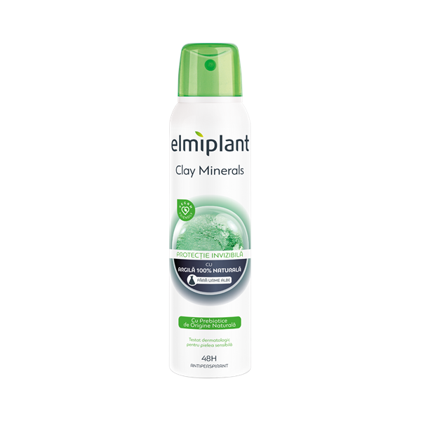 Cu Argilă 100% Naturală, protecție timp de 48 de ore, prebiotice de origine naturală și formulă împotriva petelor albe, deodorantul antiperspirant spray Elmiplant Clay Minerals oferă protecție invizibilă și un parfum fresh fructat, dublat de o notă de bază de vanilie.