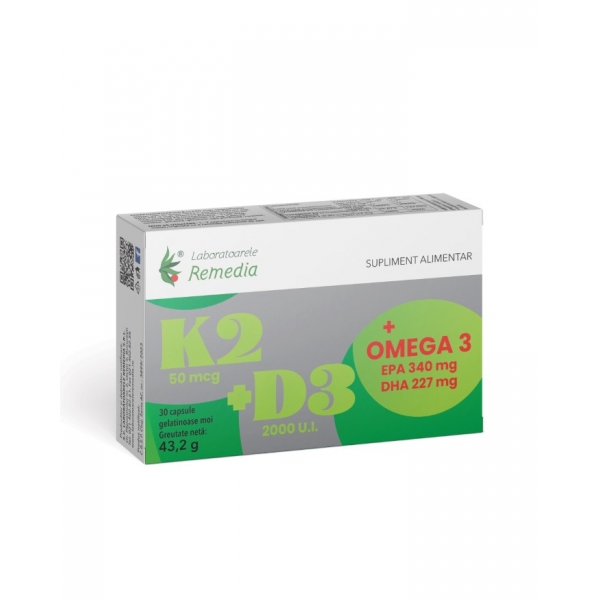 NOTA: Fotografia produsului K2+D3+OMEGA 3 30CPS GELATINOASE MOI produs de REMEDIA are caracter informativ si poate contine accesorii ce nu sunt incluse in pachetul standard al produsului sau pot exista diferente intre aceasta si produsului K2+D3+OMEGA 3 30CPS GELATINOASE MOI.