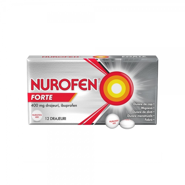 NOTA: Fotografia produsului Nurofen Forte, 400 mg, 12 drajeuri produs de Efarma, Romania are caracter informativ si poate contine accesorii ce nu sunt incluse in pachetul standard al produsului sau pot exista diferente intre aceasta si produsului Nurofen Forte, 400 mg, 12 drajeuri.
