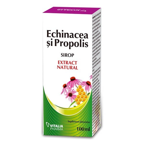 Actiune: Extractul de Echinacea poate ajuta la intensificarea aportului de substanţe bioactive necesare funcţiilor fiziologice ale sistemului imunitar şi contribuie la ameliorarea simptomatologiei unor infecţii ale căilor respiratorii superioare sau ale căilor urinare.Combinatia de Echinacea si Propolis este sinergica, produsul contribuind la sustinerea starii de sanatate a organismului si avand un efect de tonic general. La indulcirea preparatului s-a folosit zaharul invertit pentru a evita efectele nedorite ale zaharului rafinat.