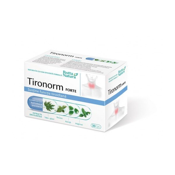Tironorm Forte este un supliment realizat exclusiv din plante care au o actiune blanda de normalizare a functiei tiroidiene. Spre deosebire de alte preparate, Tironorm intervine prin sustinerea mecanismelor naturale de mentinere a echilibrului de secretie a hormonilor tiroidieni in cazul persoanelor cu hipertiroidie. Dereglarea glandei tiroide are ca urmare perturbarea a numeroase procese metabolice, perturband grav functionarea intregului organism. Tironorm Forte ofera solutia atat pentru reducerea functionarii in exces a glandei tiroide, cat si asupra urmarilor cauzate de aceasta( tahicardie, nervozitate, transipratie excesiva, etc.). Plantele din compozitie (Talpa-gastei, Roinita, Maghiranul si Busuiocul) au fost atent selectionate pe baza rezultatelor studiilor stiintifice ce confirma eficienta lor in sustinerea sanatatii tiroidei, consolidand astfel recunoasterea beneficiilor cunoscute de utilizarea lor traditionala.