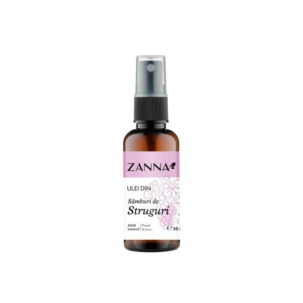 Ulei din Samburi de Struguri 100% Natural Presat la Rece Zanna, 50 ml: ulei din samburi de struguri, presat la rece, 100% natural. Uleiul din samburii de struguri se absoarbe rapid in piele, hidrateaza si regenereaza. Se poate utiliza pentru hidratarea pielii aspre a coatelor, genunchiilor, calcaielor, sau impreuna cu lotiuni de corp, creme, lotiuni de plaja si multe altele, pentru o hidratare mai intensa. Samburii de struguri au propietati antioxidante, antiseptice, accelereaza regenerarea celulara si intarzie procesul de imbatranire a pielii. In plus, utilizat pe post de masca de par ca adjuvant, combate caderea parului.