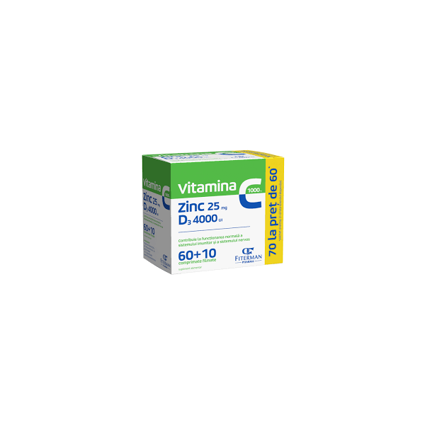 NOTA: Fotografia produsului VITAMINA C + ZINC + D3 4000 UI 30 CPR . produs de Fiterman Pharma are caracter informativ si poate contine accesorii ce nu sunt incluse in pachetul standard al produsului sau pot exista diferente intre aceasta si produsului VITAMINA C + ZINC + D3 4000 UI 30 CPR ..